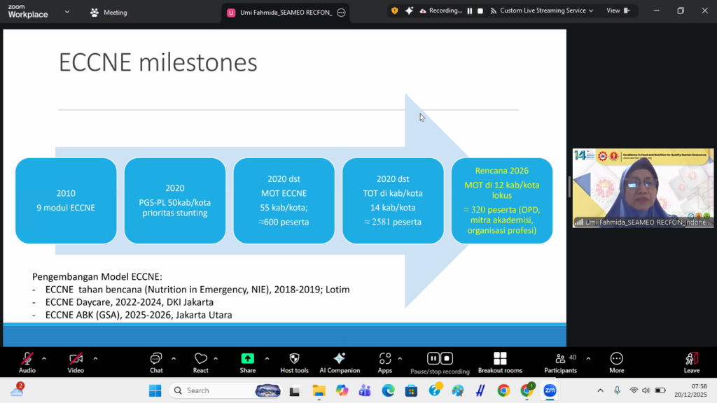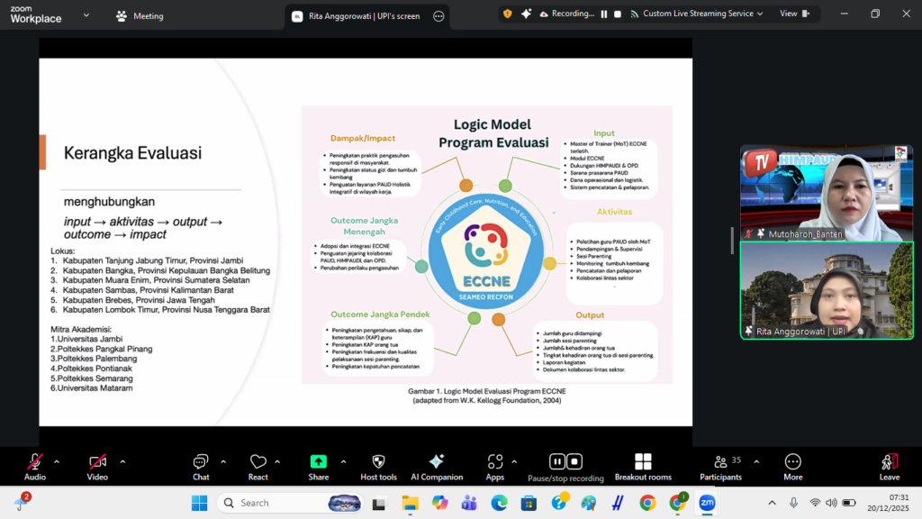 On December 20th, 2025, the Central Executive Board of the Indonesian Association of Early Childhood Educators and Education Personnel (PP HIMPAUDI), in collaboration with SEAMEO RECFON, organised a HIMPAUDI TV Talkshow entitled “A Week of Good Practices in the Early Childhood Care, Nutrition, and Education (ECCNE) Programme”. The event was conducted online via Zoom Meeting and livestreamed on the HIMPAUDI TV YouTube channel, with 54 participants comprising early childhood educators, education personnel, families, and members of the general public.