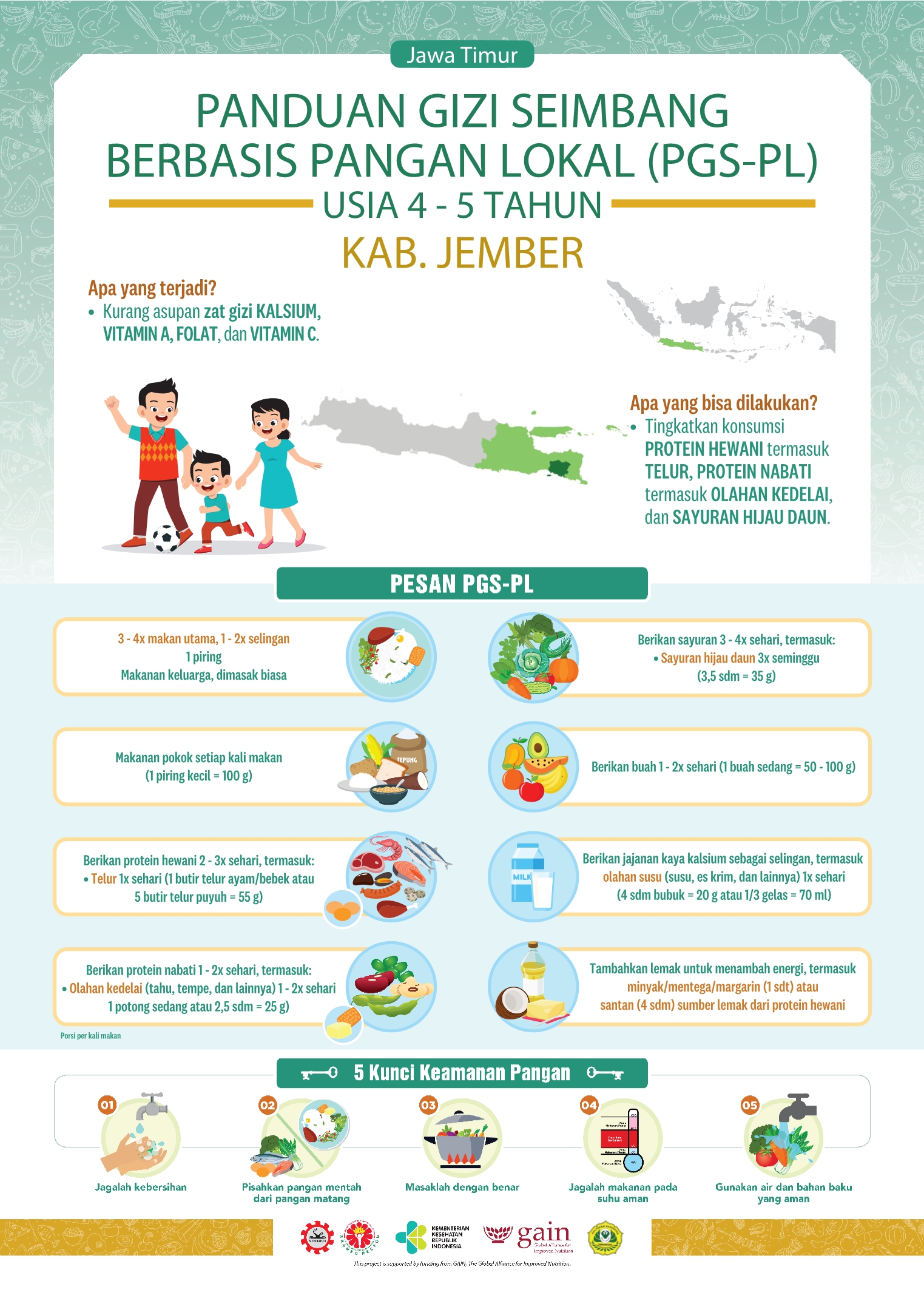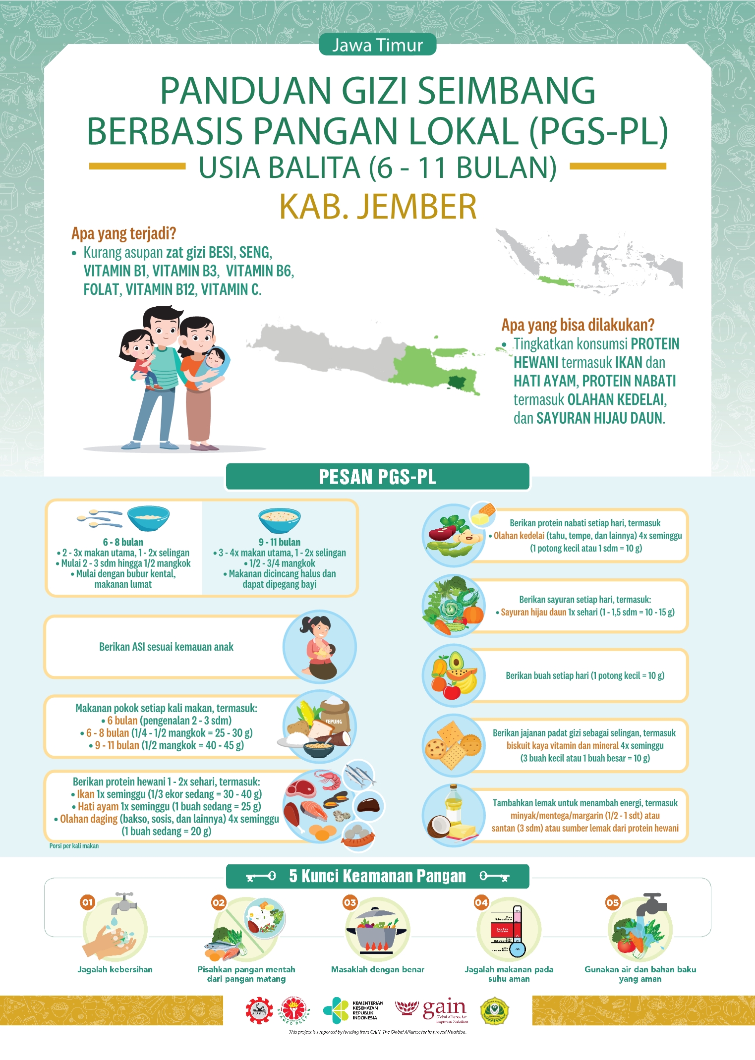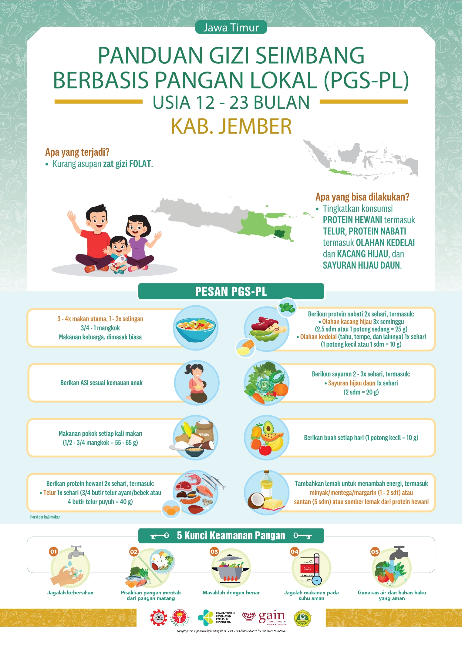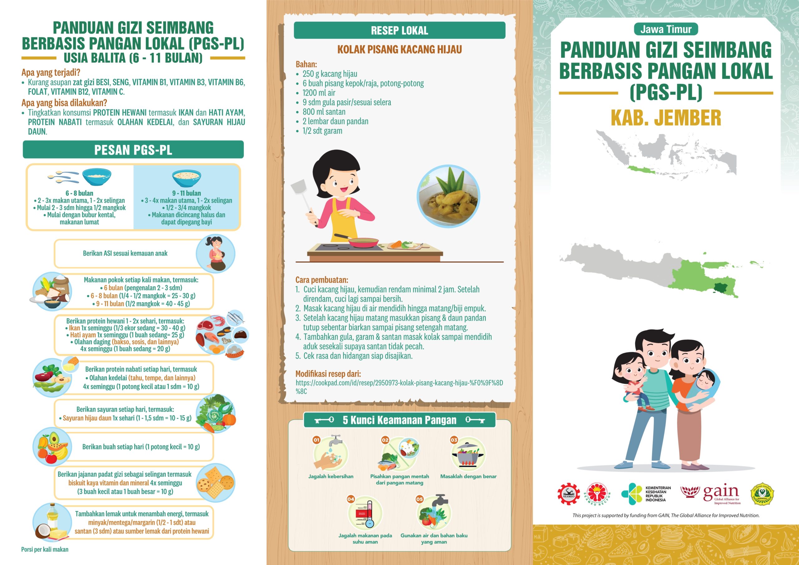Kabupaten Jember terletak di Jawa Timur. Daerah ini memiliki letak yang strategis karena berada di persimpangan antara Surabaya dan Bali, sehingga perkembangannya cukup pesat dan menjadi barometer pertumbuhan ekonomi di kawasan Timur Jawa Timur. Resep lokalnya adalah Kolak Pisang Kacang Hijau! Manis dan menyegarkan, bukan? Perlu dicoba nih!