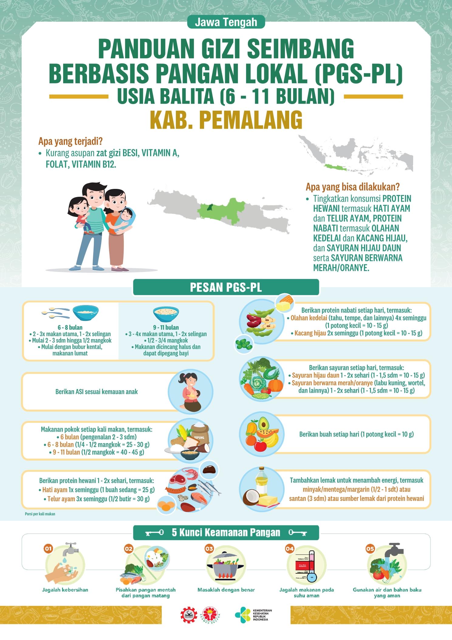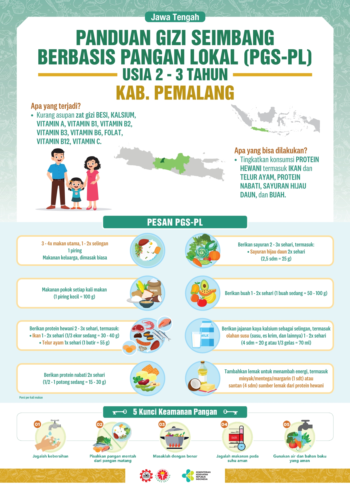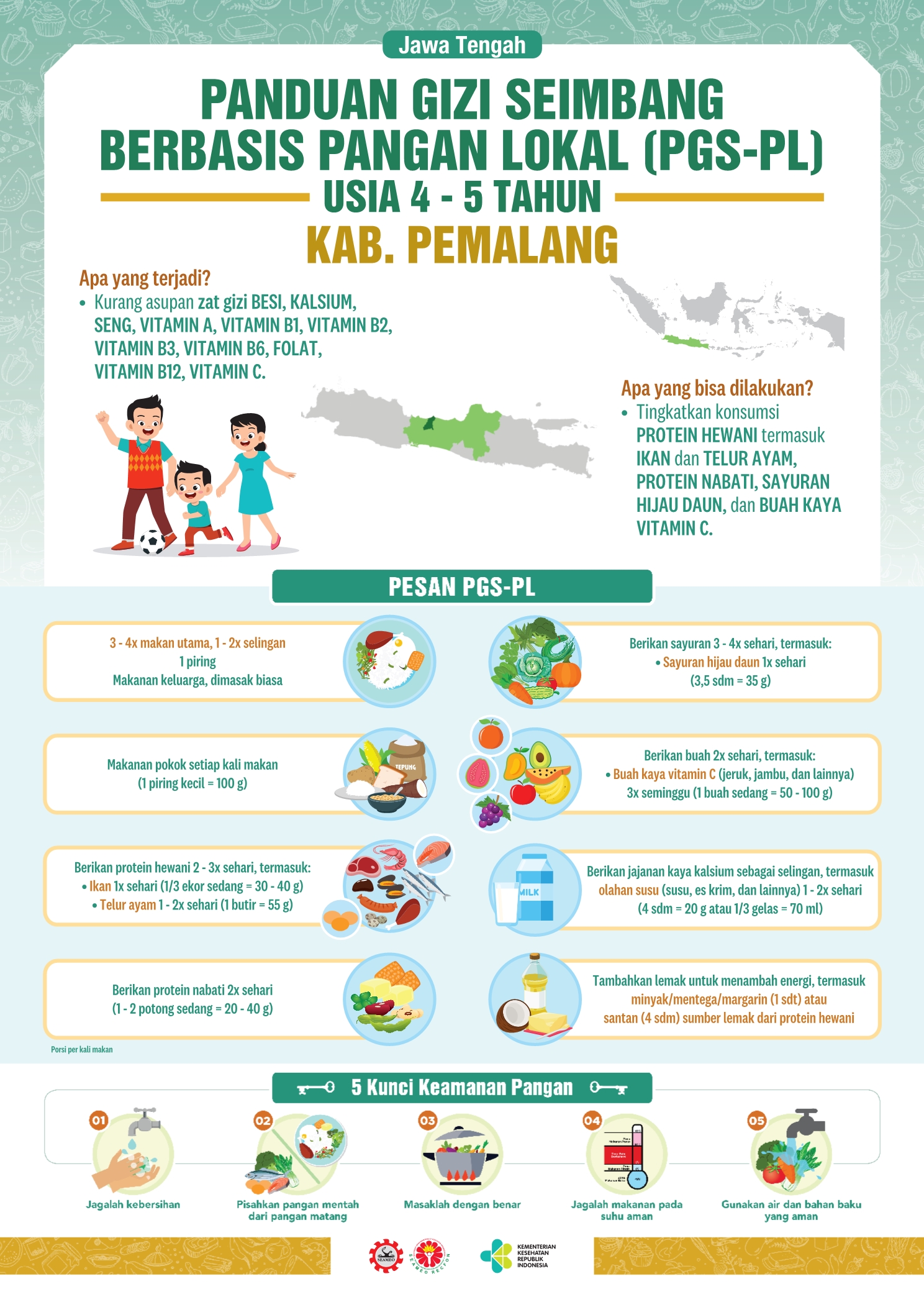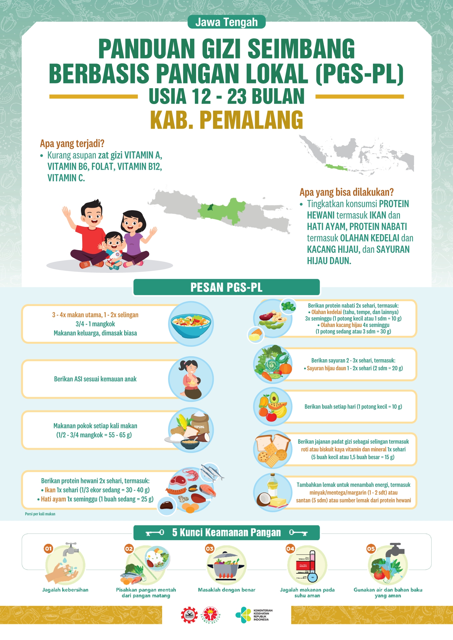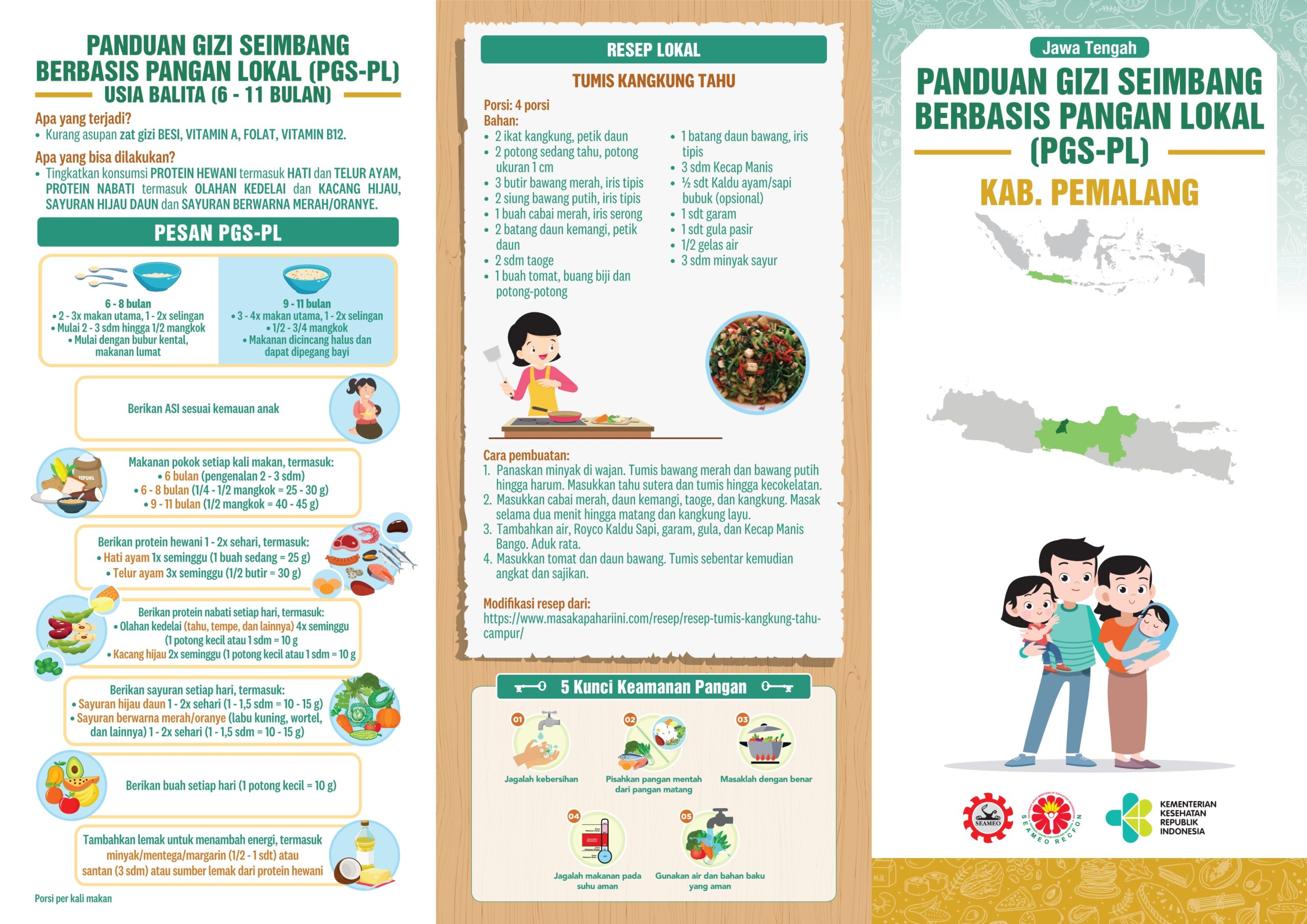 Kabupaten Pemalang terletak di pesisir utara Provinsi Jawa Tengah, dengan luas 111.530 Ha. Sektor pertanian dan perdagangan merupakan sektor yang sangat dominan dalam perekonomian Kabupaten Pemalang. Resep pangan lokalnya adalah Tumis Kangkung Tahu. Sederhana dan bergizi, kan? Coba dimasak yuk!